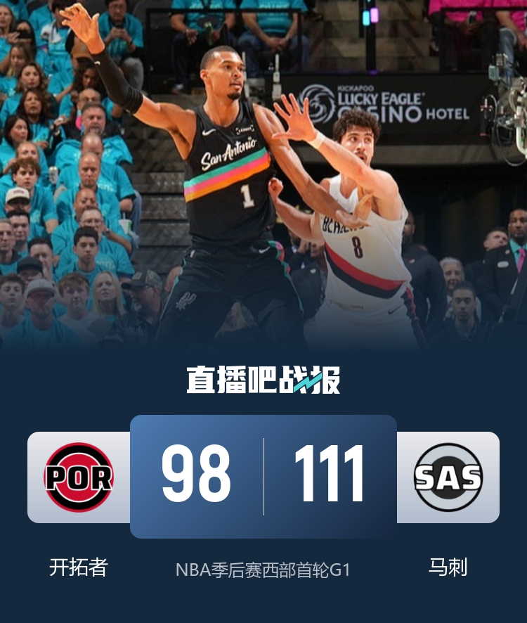 马刺(1-0):文班亚马35分5板1助2帽、卡斯尔17分7板7助、福克斯17分5板8助、瓦塞尔15分3板2助2帽、科内特10分6板1助、尚帕尼6分5板2助3断、哈珀6分4板2助、凯尔登3分7板1助、巴恩斯2分1板、布莱恩特2板。