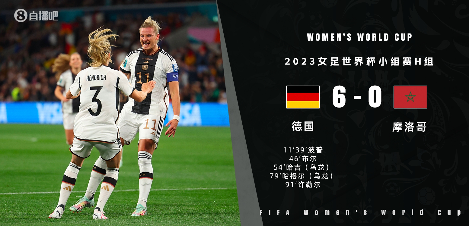 直播7月24日讯 北京时间7月24日下午16:30,女足世界杯H组首轮,德国女足对阵摩洛哥女足。上半场,波普头球梅开二度。下半场,布尔带球入场,摩洛哥女足连续自摆乌龙,许勒尔补射。全场结束,德国女足6-0摩洛哥女足。