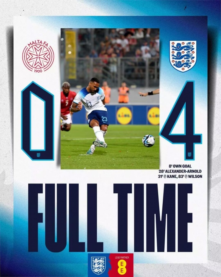 下半场补时3分钟,马耳他0-4英格兰。