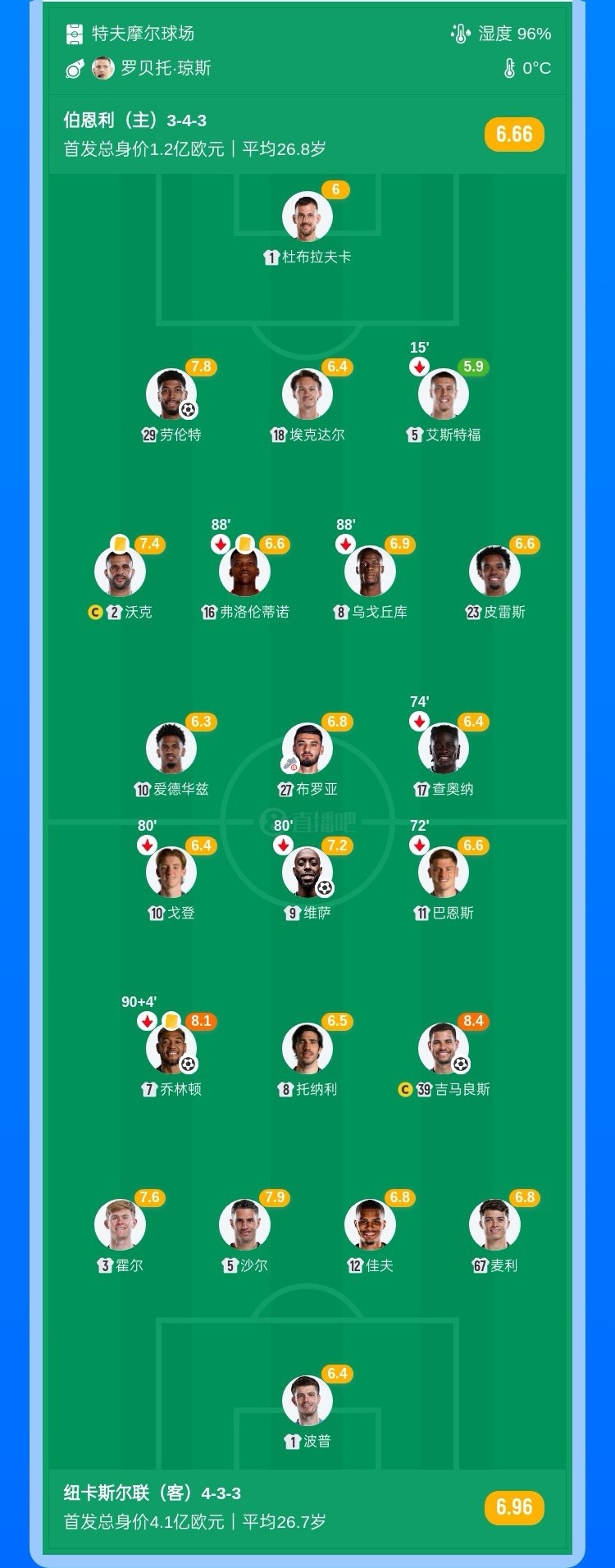 第7分钟,纽卡前场右路连续的短传配合,禁区右侧巴恩斯的打门被门将扑出,门前乱战吉马良斯和维萨双鬼拍门,最终由维萨补射入网,纽卡2-0领先↓
