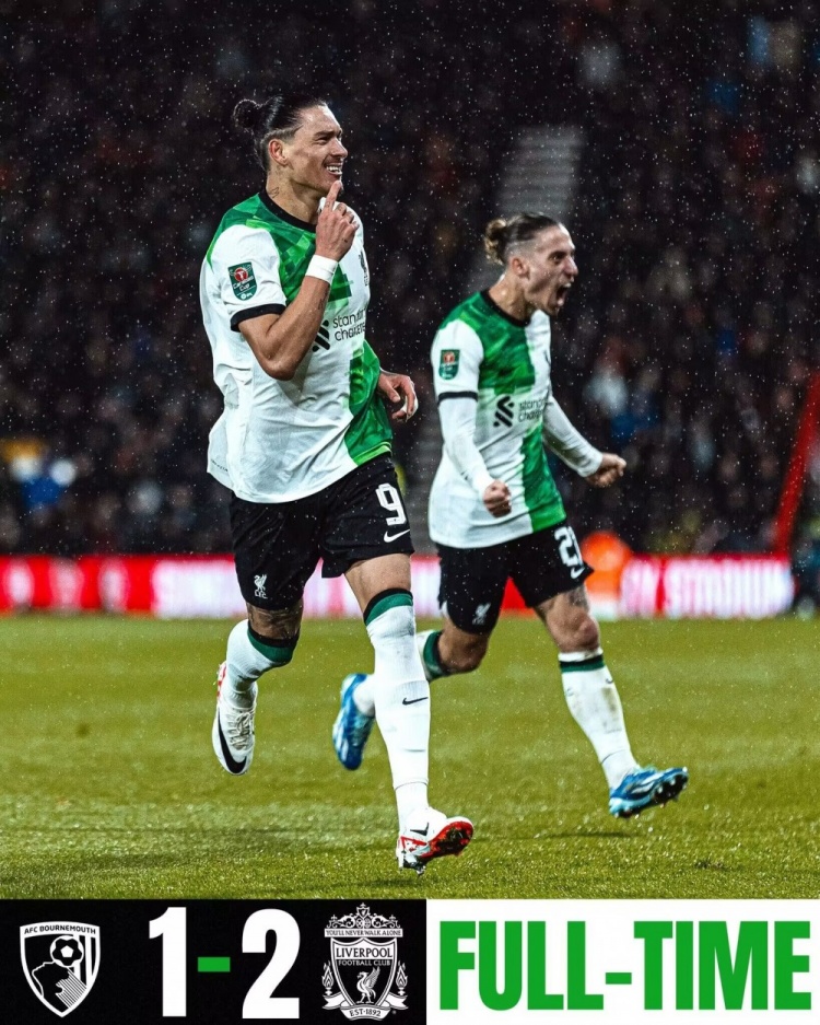 11月2日讯北京时间11月2日凌晨3:45,联赛杯第4轮,利物浦客场挑战伯恩茅斯。上半场,埃利奥特打门被挡,加克波补射破门为利物浦取得领先;下半场,戈麦斯上演门线解围,贾斯汀-克鲁伊维特破门将比分扳平,努涅斯世界波将比分超出!全场比赛结束,利物浦2-1伯恩茅斯晋级八强!