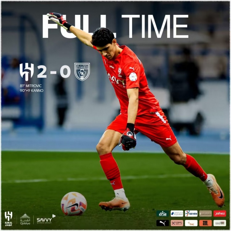 利雅得新月首发:37-布努、3-库利巴利、87-坦巴蒂、12-沙赫拉尼(86'26-马尔基)、66-阿卜杜勒哈米德、28-穆罕默德-卡努、16-纳赛尔-多萨里(72'14-哈姆丹)、29-萨勒姆-多萨里、96-迈克尔(96'2-布莱克)、77-马尔科姆、9-米特洛维奇(90'11-谢赫里)