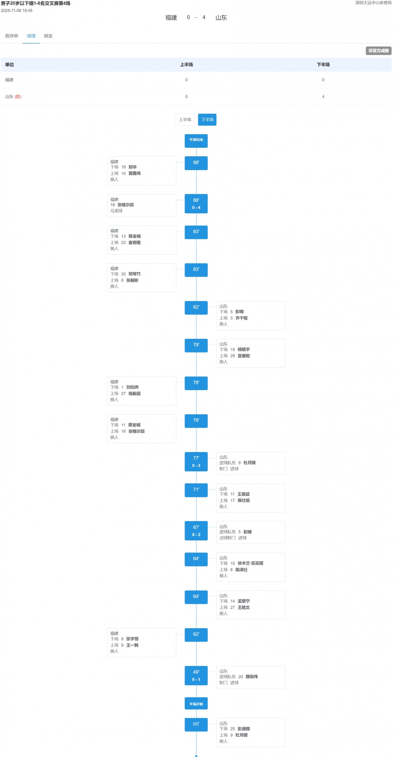 11月08日讯 全运男足U20 1/4决赛,山东U20以4-0淘汰福建U20晋级8强,将会在4强对阵湖北U20。本场比赛,路俊伟(49')、彭啸(67')、杜月徵(77')为山东U20进球,张格尔燚(88')乌龙。