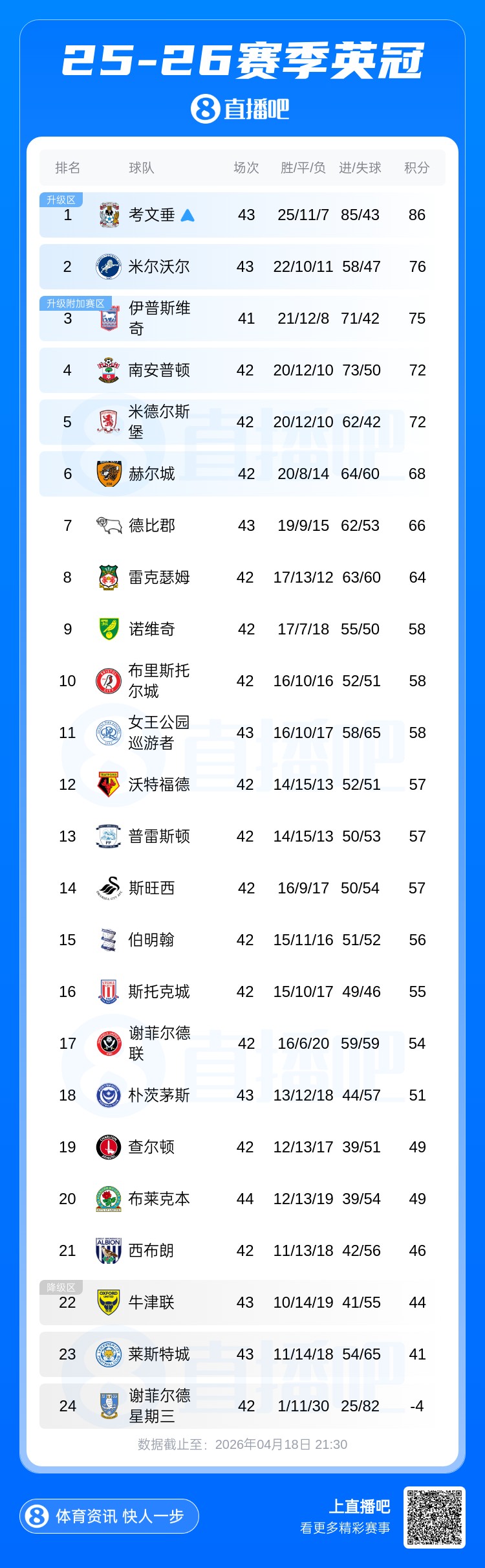 在英冠积分榜上,莱斯特城43场积41分(财务违规被扣6分),多赛一场仍旧落后安全区5分,还剩3轮的情况下保级形势岌岌可危。