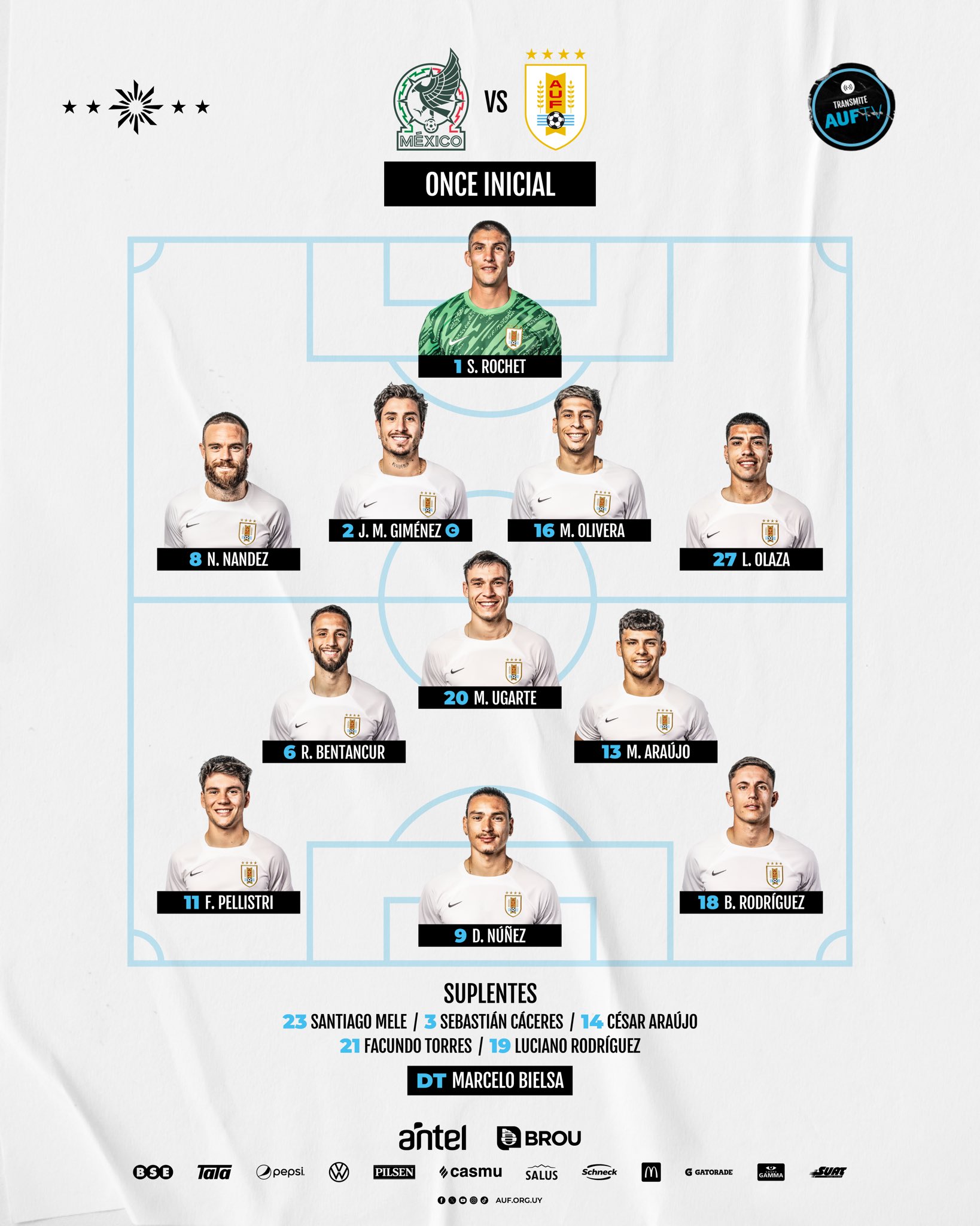 乌拉圭首发:1-罗切特、27-奥拉扎、16-奥利维亚、2-吉梅内斯、8-南德斯、20-乌加特、6-本坦库尔、13-M-阿劳约、11-佩利斯特里、18-B-罗德里格斯、9-努涅斯