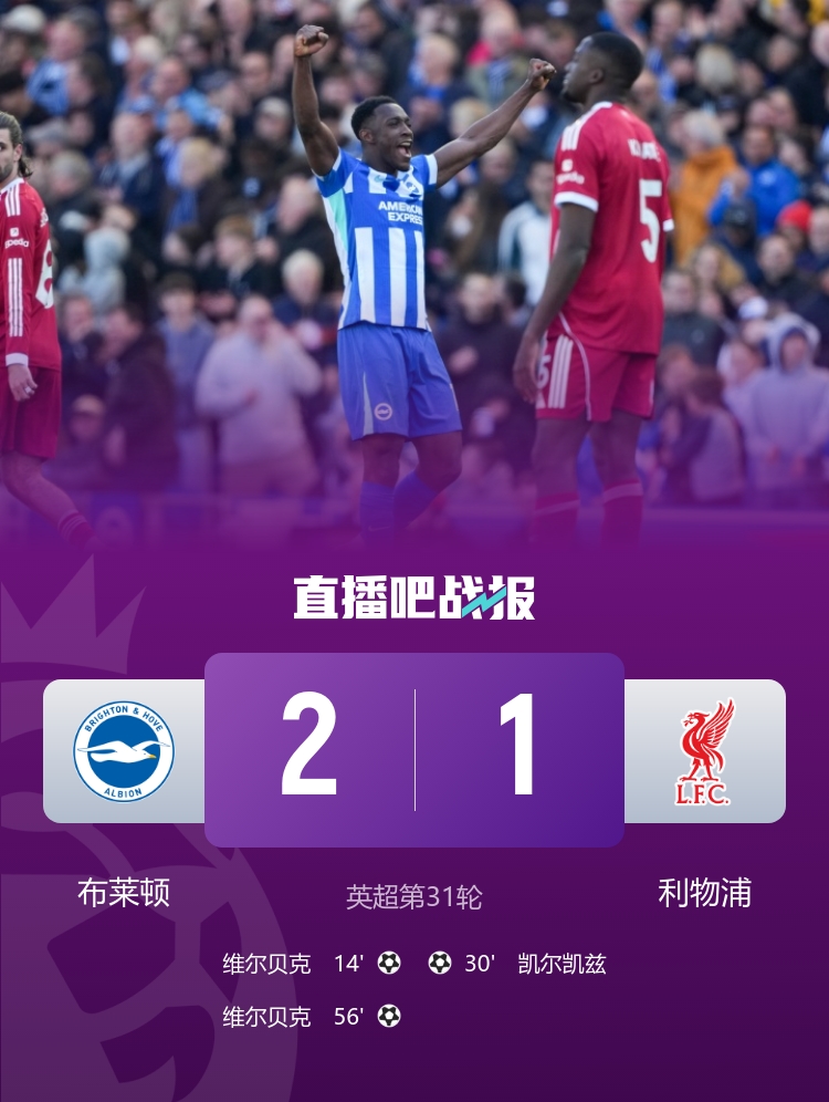 3月21日讯 北京时间3月21日晚上20:30,英超第31轮,布莱顿坐镇美国运通社区球场对阵利物浦。上半场,埃基蒂克伤停,维尔贝克破门,邓克乌龙助攻凯尔凯兹破门。下半场,维尔贝克梅开二度。全场结束,布莱顿2-1利物浦。本场过后,布莱顿积43分暂升第八;利物浦积49分排名第五,仅领先第六的切尔西1分。