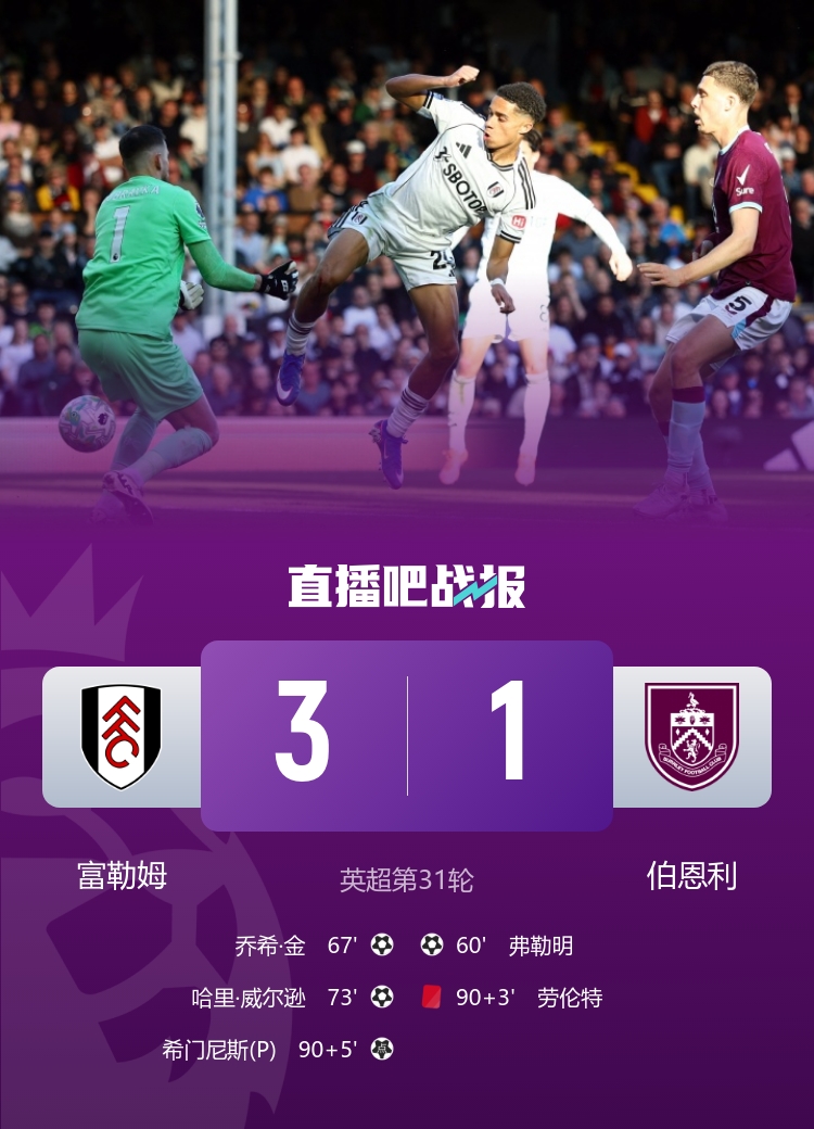 下半场补时6分钟,富勒姆3-1伯恩利。
