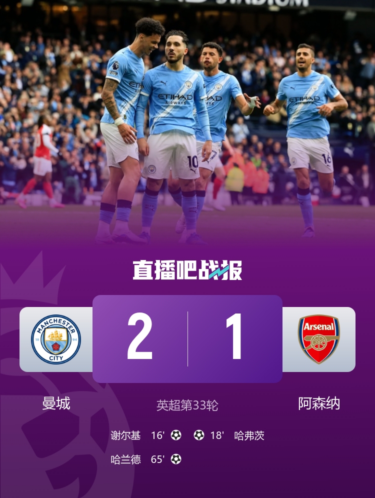 4月20日讯 北京时间4月19日晚23时30分,2025-26赛季英超第33轮天王山之战在阿提哈德球场展开角逐,曼城主场迎战阿森纳。上半场谢尔基一条龙首开记录,多纳鲁马超巨失误送礼,哈弗茨扳平比分,下半场哈兰德破门,埃泽和加布里埃尔中柱,罗德里伤退。最终曼城主场2-1战胜阿森纳,曼城取得各赛事4连胜,阿森纳联赛两连败。积分榜方面,曼城少赛1场积67分仍居第2,枪手积70分位居榜首。