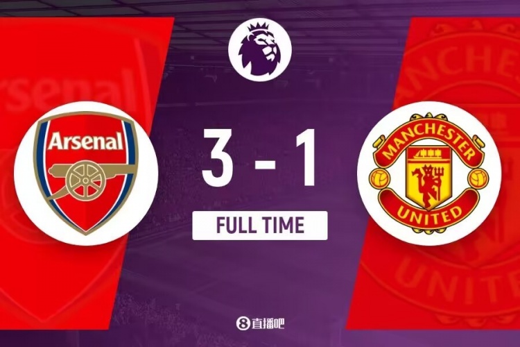下半场补时8分钟。最终全场比赛结束,阿森纳3-1曼联