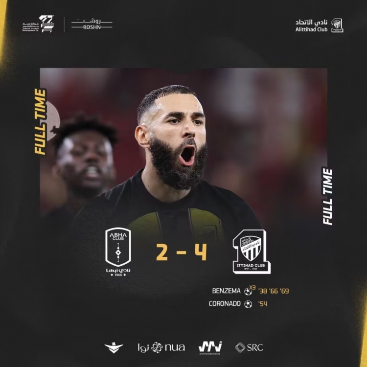 第68分钟,吉达联合的反击机会,科罗纳多推进后横敲,本泽马轻松低射得分,吉达联合4-1艾卜哈!↓