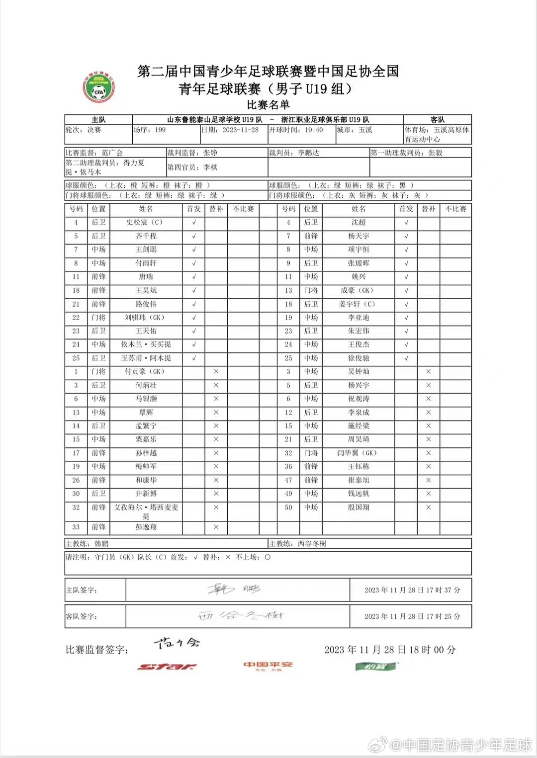 最终全场比赛结束,山东泰山U19队3-1战胜浙江U19队,获得第二届中国青少年足球联赛男子U19组冠军。