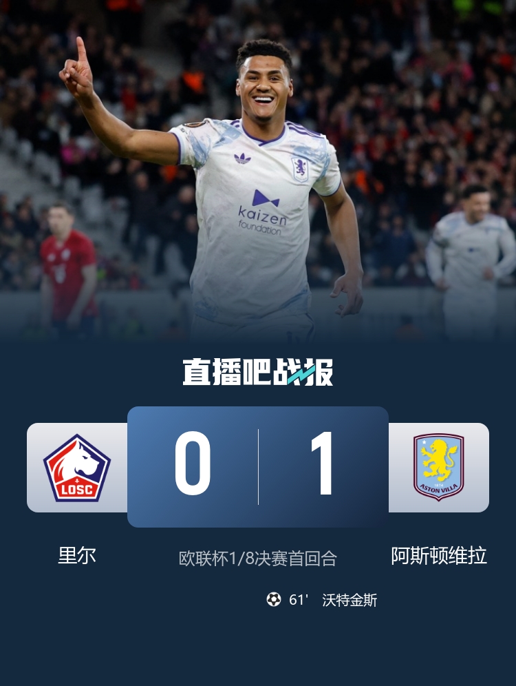 3月13日讯 北京时间3月13日凌晨1:45,欧联杯1/8决赛首回合,里尔坐镇皮埃尔-莫鲁瓦球场迎战维拉。上半场两队都未能制造太好的机会,暂时0-0战平;下半场沃特金斯头球破门,随后错失一次单刀球机会,最终维拉客场1-0战胜里尔,占据晋级先机。两队次回合交手将是在北京时间3月20日凌晨4:00,维拉在主场迎战里尔。