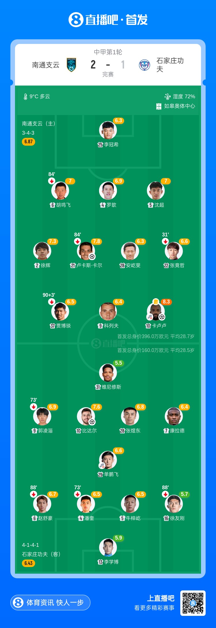03月14日讯 2026赛季中甲第1轮,南通支云坐镇主场迎战石家庄功夫。第64、66分钟卡卢卢、卢卡斯·卡尔连进两球,帮助南通取得2-0领先;第87分钟比达尔为石家庄扳回一球。最终90分钟比赛结束,南通支云2-1取得开门红。