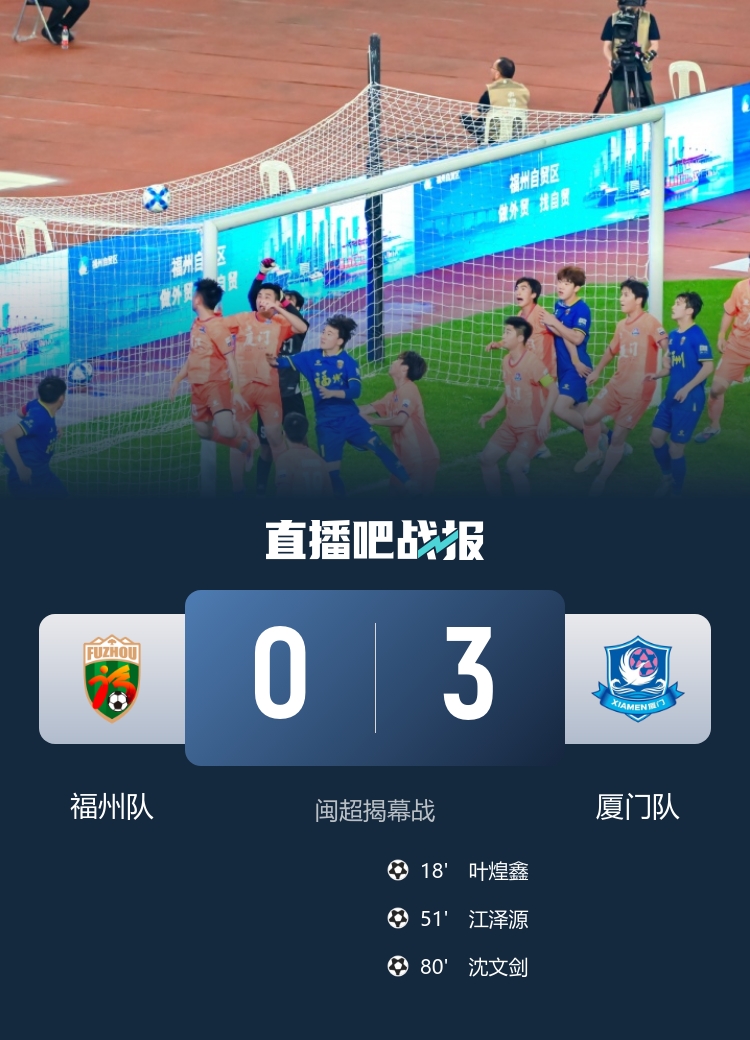4月19日讯 北京时间4月19日19:30,闽超揭幕战福州迎战厦门的比赛在福州海峡奥体中心体育场进行,上半场叶煌鑫推射破门打进闽超首球,下半场江泽源头球破门扩大比分,沈文剑一条龙破门,最终厦门3-0福州取得开门红。