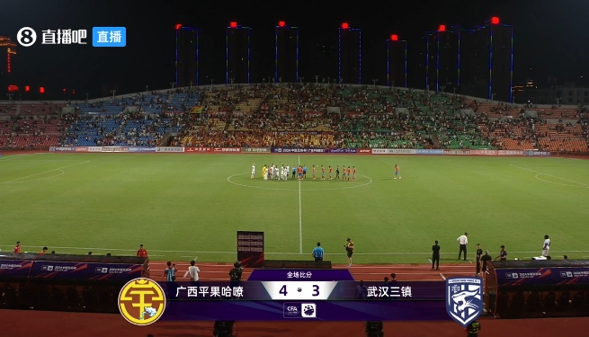 伤停补时4分钟。全场比赛结束,武汉三镇3-4广西平果哈嘹。