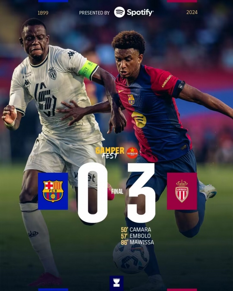 8月13日讯 甘伯杯,巴萨对阵摩纳哥。上半场,拉菲尼亚破门被吹。易边再战,卡马拉、恩博洛、马维萨连进三球,京多安伤退。最终巴萨0-3不敌摩纳哥。
