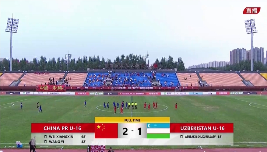 8月20日讯 北京时间8月20日下午15:30,中国U16男足与乌兹别克斯坦U16男足进行一场邀请赛。上半场,舒库鲁拉耶夫世界波,王一扳平。下半场,魏祥鑫洞穿大小龙门。全场比赛结束,中国U16男足2-1乌兹别克斯坦U16男足。